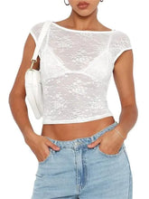 Women Short Sleeve Crop Top Y2k Floral Lace Backless Top Sheer Mesh See Through Top Going Out Streetwear(A-Whitem)